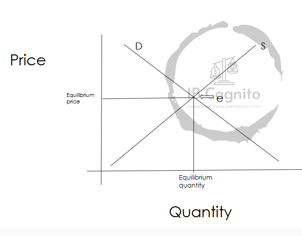 Demand = Supply; at point e Any price above or below the equilibrium price creates disequilibrium in market; either there is a surplus or a shortage of the good.