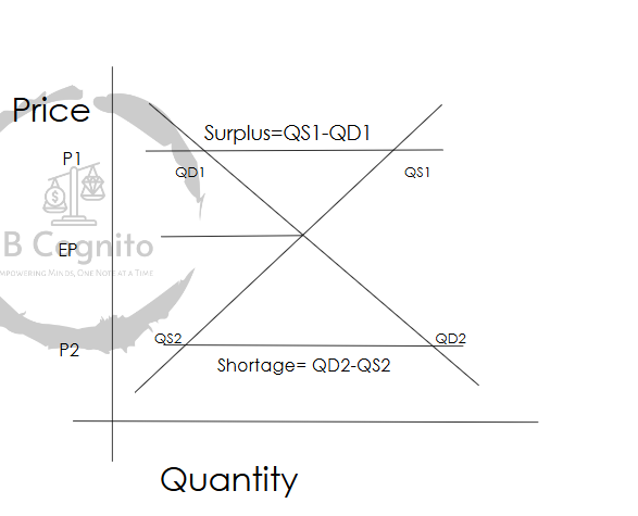 A price below EP will result in a shortage, as demand extends but supply contracts. The amount of shortage is equal to the distance between the point on the demand curve and the point on supply curve where price intersects.