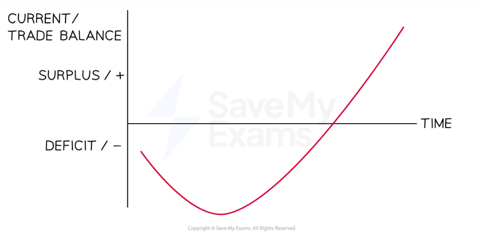This graph is easy to explain with the Marshall-Lerner curve. We see that initially the deficit worsens, this is the adjusting period where PED remains inelastic; however, eventually, once both parties have adjusted, the condition is met and cumulative PEDs add up to greater than 1, causing the deficit to improve, leading to a surplus.